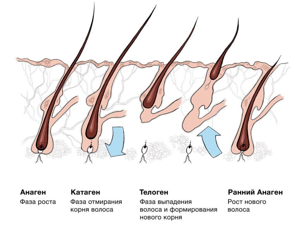 Волосы на голове растут циклически, каждый цикл состоит из трех основных фаз: