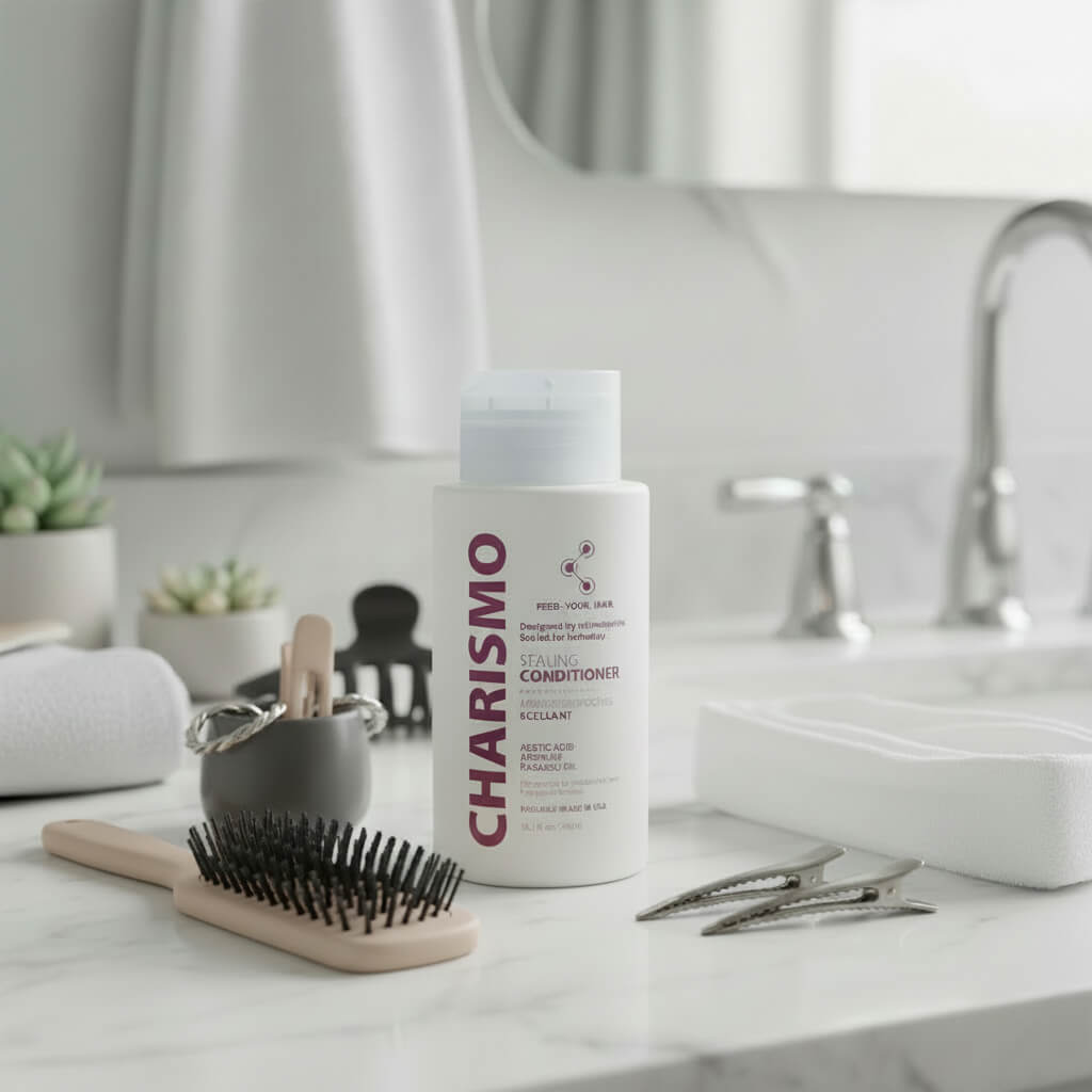 - Нанесите небольшое количество кондиционера-герметика (примерно размером с лесной орех) на длину волос, отступая от корней примерно 5 см